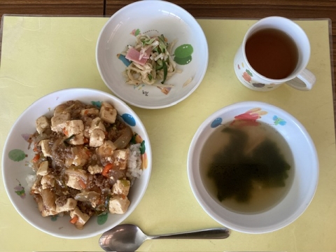12/16 本日のお給食 マーボー豆腐丼 切り干し大根とハムのサラダ 中華スープ 今日も良いお天気ですね。 寒いですがみんなとっても元気です。 お給食をもりもり食べて寒さを吹き飛ばしましょうね。
