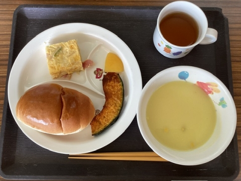 10/14 本日のお給食 ロールパン チーズ入りスペイン風オムレツ かぼちゃスティック コーンスープ 桃缶 今日は年少さんの公開教育です。 仮装をしてハロウィンパーティを楽しみます。 どんなことをするのかワク..