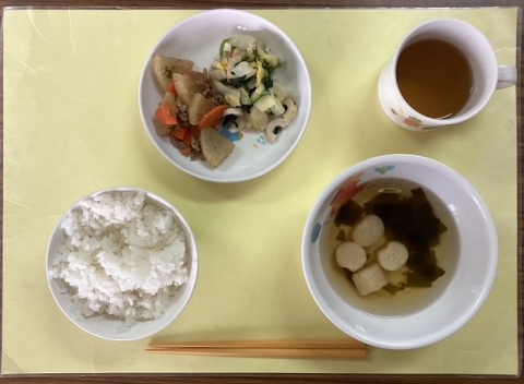 1/26 本日の給食ご飯豚肉と大根のてりに白菜と小松菜の中華あえすまし汁本日はとても寒いです。寒さに負けずお給食を..