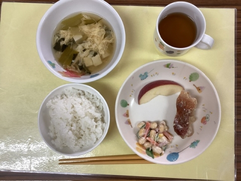 12/25 本日のお給食 ご飯 魚の煮付け 大豆サラダ かき玉汁 りんご メリークリスマス! みんなのところにサンタさんは来ましたか? 今年もあとわずか、元気に過ごしましょうね。
