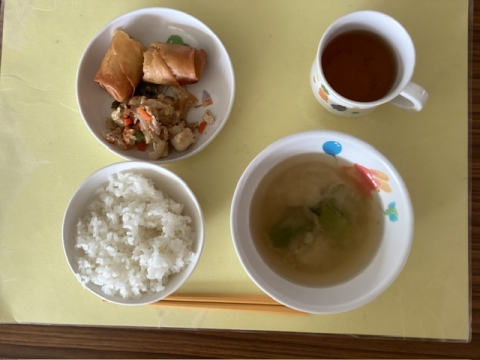 4/9 本日のお給食ご飯味噌汁炒り豆腐春巻き今日は少し曇り空ですね。年長さんはパラバルーン遊びをしました。み..