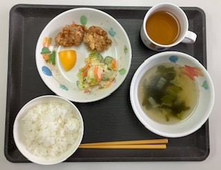 4/10 本日のお給食ご飯とりの唐揚げキャベツサラダ中華スープももかん今日は雨が降っていて少し